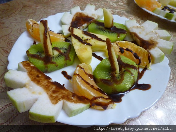 我們家不太吃蛋糕,老婆又有打果汁的嗜好,姊妹倆便邀奶奶一起做了她們所謂的水果拼盤蛋糕給老婆大人慶生。