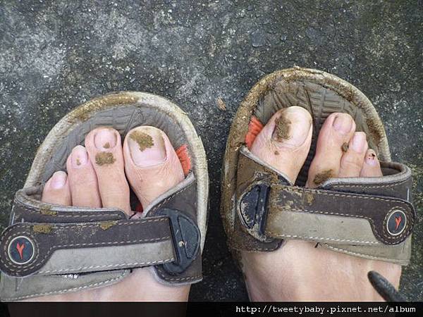 重點是土路濕滑,顯然不是穿涼鞋登山的好時機。